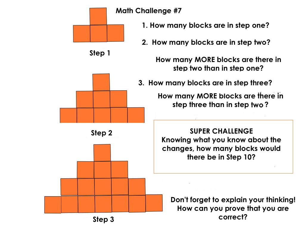 We have created math challenges for our students to try and solve. These problems started out fairly simply; and each week the challenges have increased in complexity. The newest challenge is always at the top of this page.
